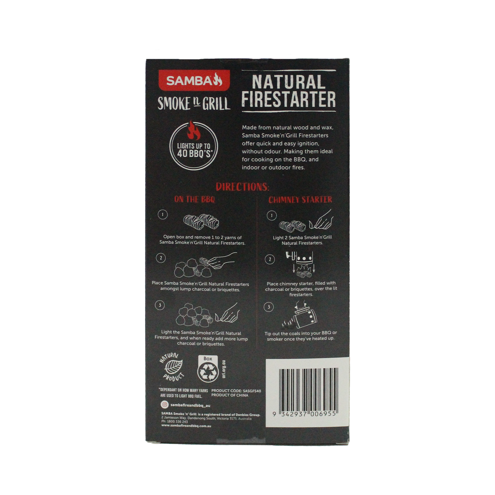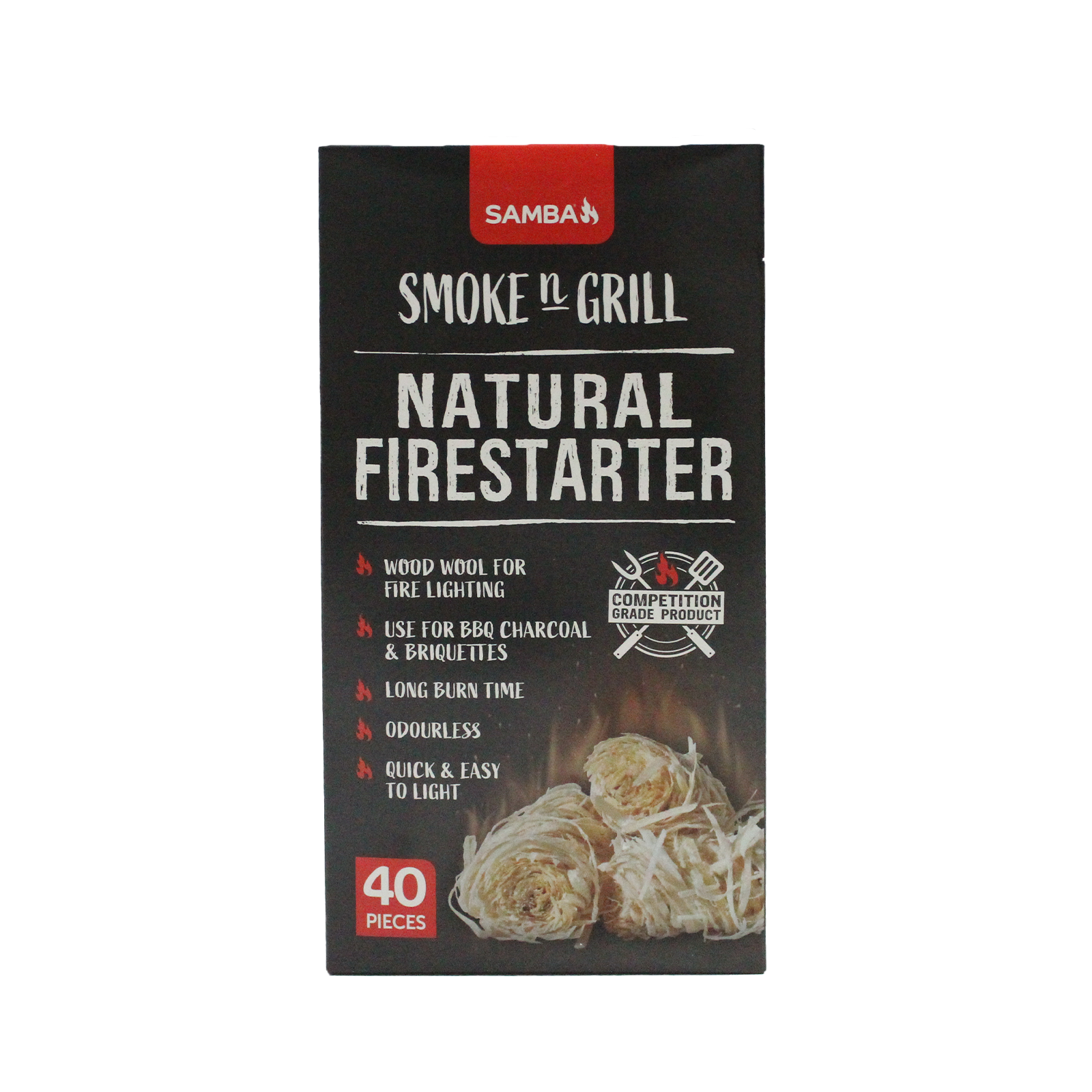 Made from natural wood and wax, Samba Smoke 'n' Grill Natural BBQ Firestarter's offer quick and easy ignition, without odour, making them ideal for cooking on the BBQ.